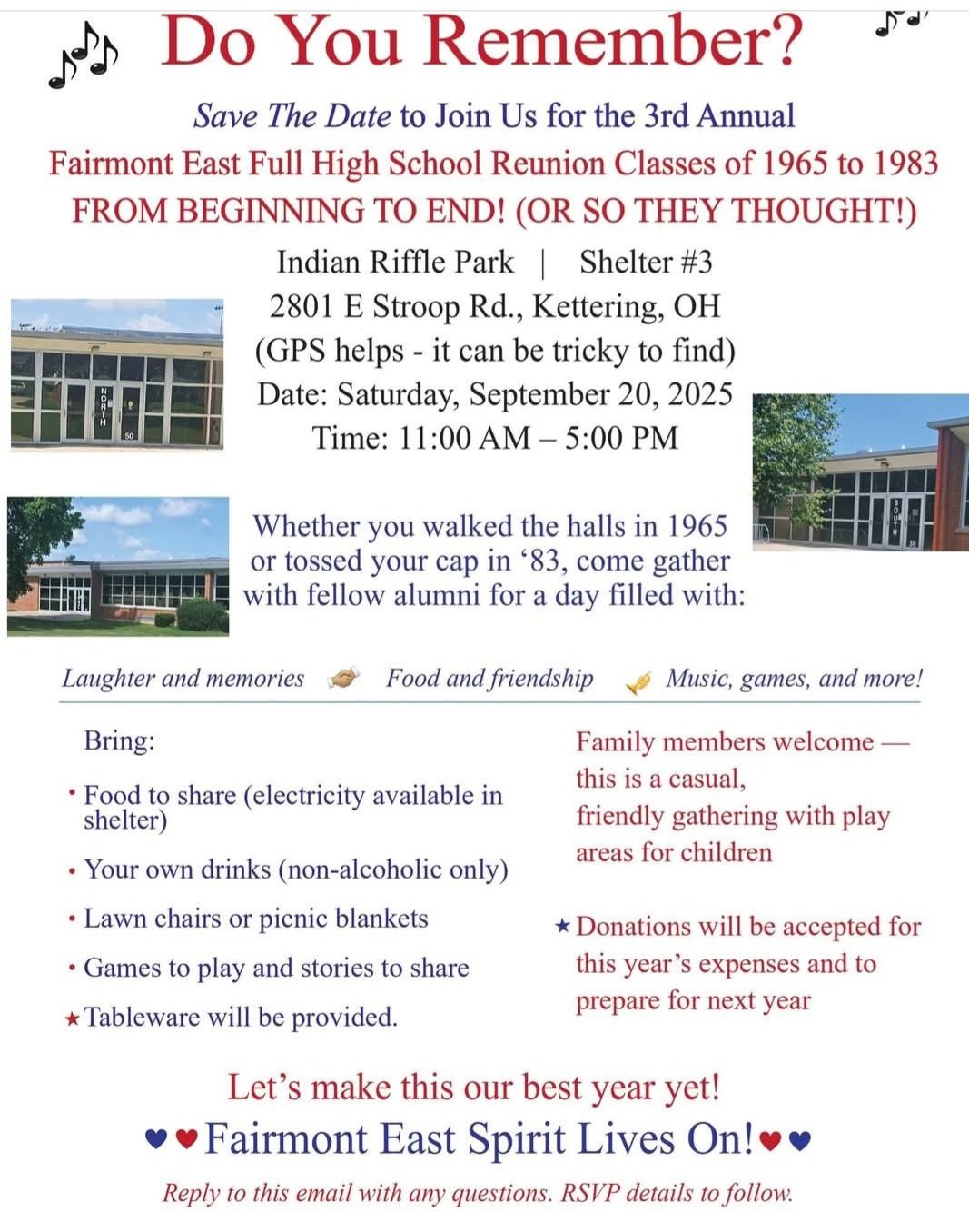 Join us for the 3rd annual Fairmont East "from the beginning to the end" All Years Reunion on Saturday, Sept. 20, 2025. See details in the image below.